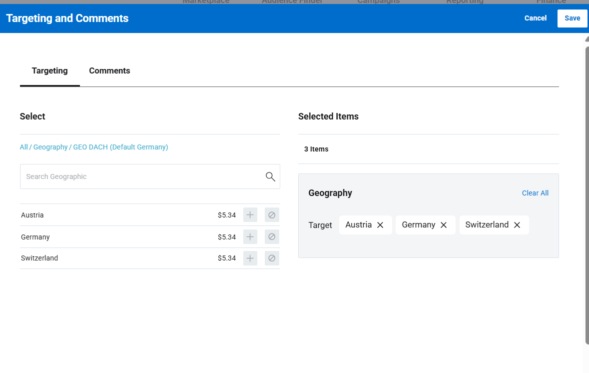 - Targeting - simply click on the field and a pop up box will appear. The options available will vary depending on what the publisher has made accessible to select.