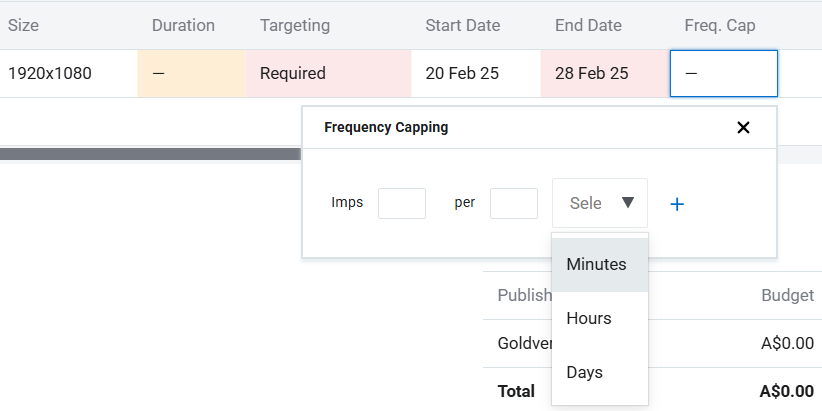 - Frequency Capping - once you click on the field a drop down option will appear allowing you to enter in the impressions per criteria.