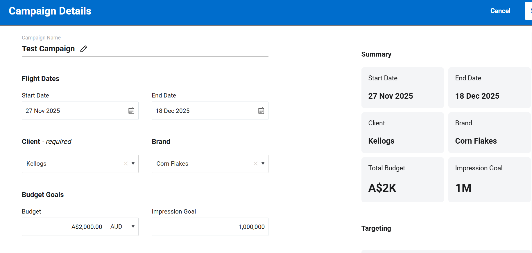 - Total Budget, Currency & Impressions (This total budget is not shown to Publishers).