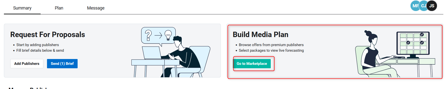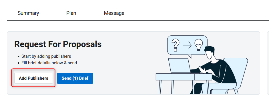 2.) To RFP Publishers, simply click on the box "Add Publishers" in the "Requests for Proposals" box and add your preferred Publishers. Then click "Send Brief(s)".