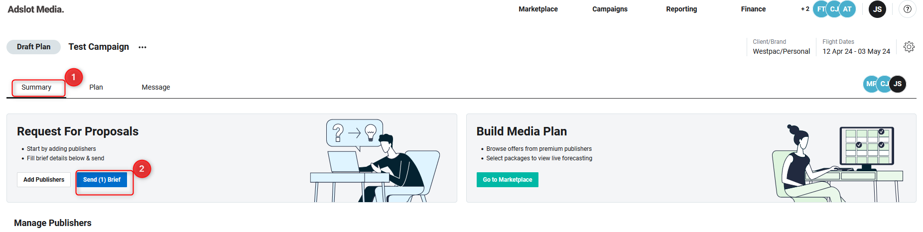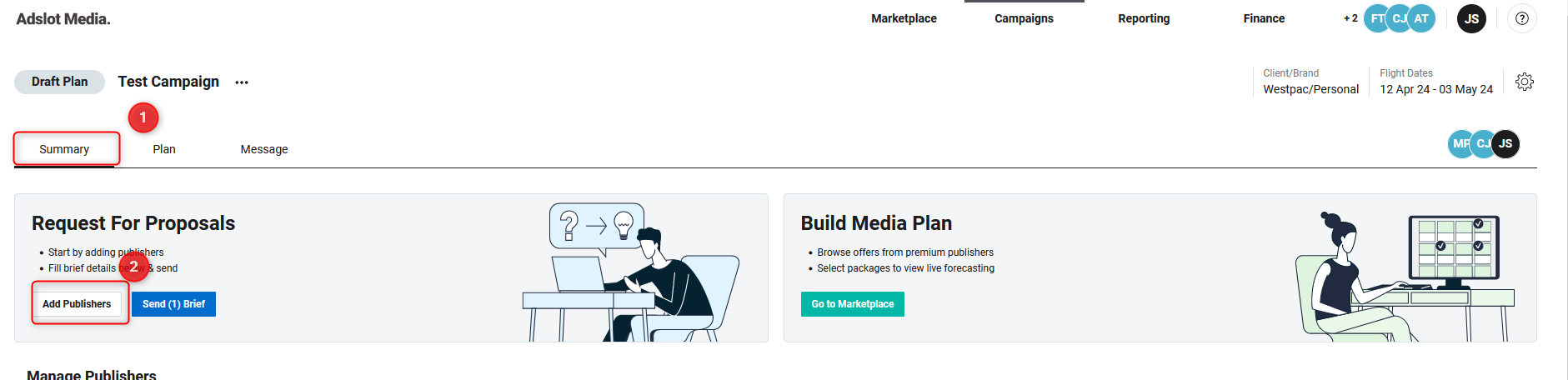Once inside the campaign, navigate to the “Summary” tab and select “Add Publishers” in the Request For Proposals tile.