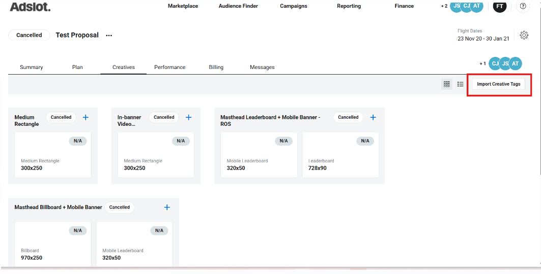 Creative upload is only possible once “Sign Off” has occurred by both the buyer and seller. To upload creatives, navigate to your desired campaign within the Campaigns tab of the top navigation bar, then click on the Creative tab.