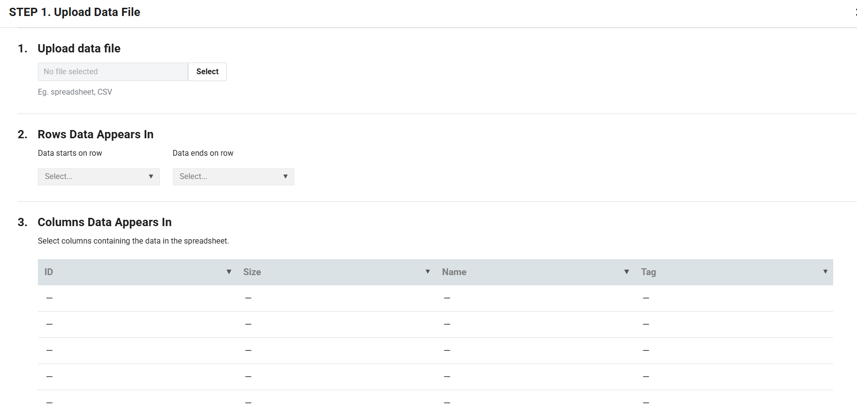 In the Column Data Appears In section, select data from the CSV.file that accurately details each column listed in the grid which are ID, Size, Name and Tag. Make sure to include every column to ensure proper upload then select Next located in the top right corner.