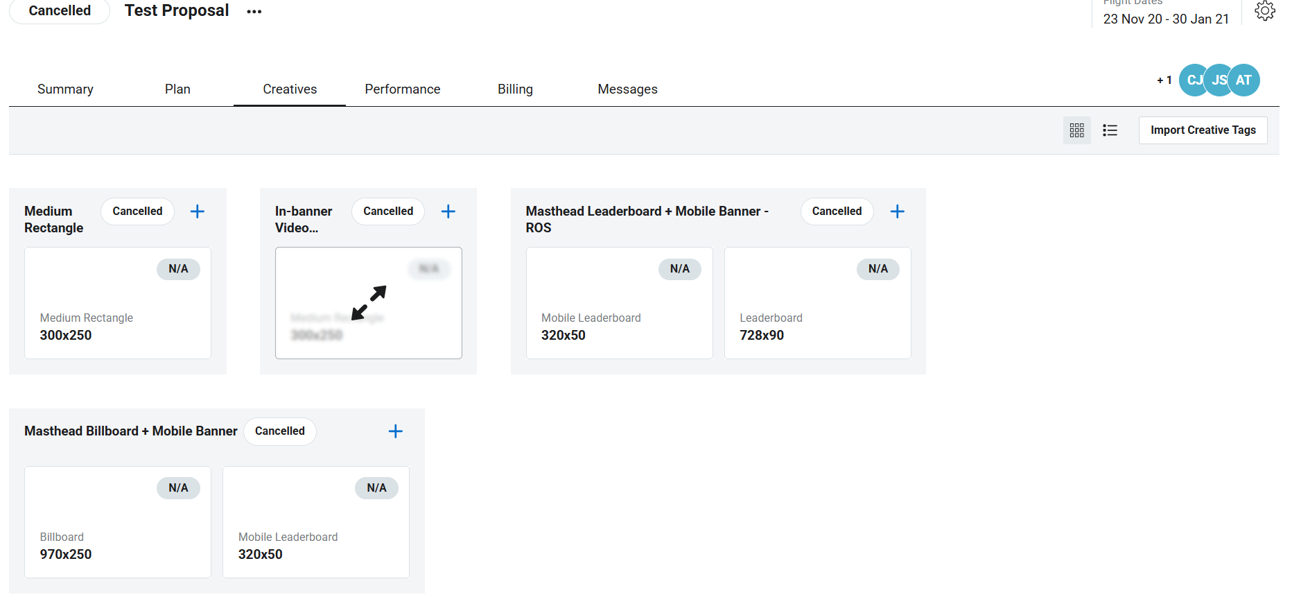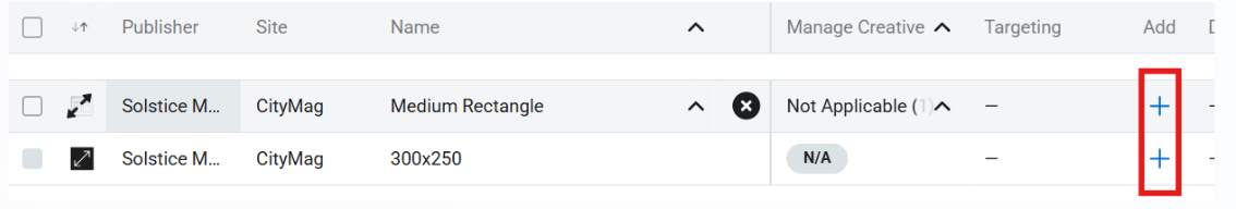 Repeat this process for all creatives. Any custom creatives can be sent to the publisher via the Inbox or uploaded as ad tags via the Manage Creative column located in the grid format of the Creative tab, as seen below. The publisher will then manually assemble the creative offline.
