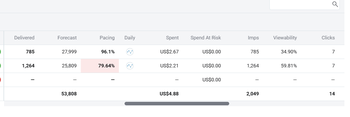 3. There are more data analytics per creative that can be seen in the right - side (where you can scroll) of the media schedule. Here, key performance metrics such as Delivered, Pacing, Impressions and Viewability are displayed.
